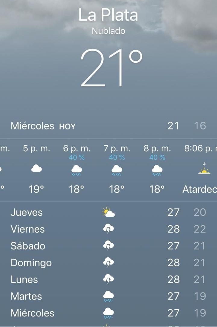 La Dirección de Hidrometeorología de La Plata coincidió con las mediciones del SMN e informó en su cuenta oficial de Twitter (@ClimaMLP) las condiciones climáticas para las próximas horas. “Seguirá el cielo nublado en la ciudad de LP con ambiente agradable. Hacia la tarde esperamos algunas precipitaciones aisladas y luego nuevamente a partir del jueves a la noche y durante el viernes con mejoras temporarias”, detallaron.
