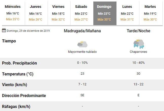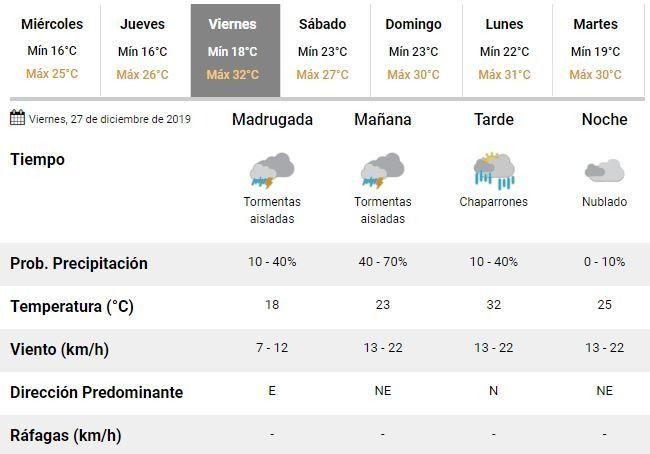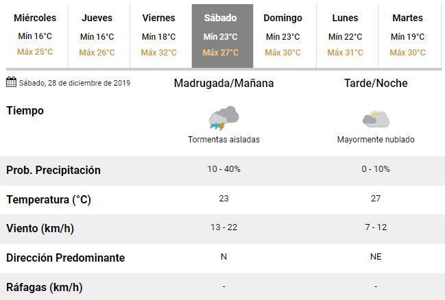 El día sábado, por otra parte, se esperan tormentas aisladas para la madrugada y las primeras horas de la mañana. El viento soplará del norte, rotando al noreste y se estima una temperatura mínima de 23°C y una máxima de 27°C.
