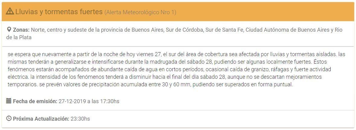 El pronóstico no es nada alentador y, según adelantaron, podrían registrarse lluvias de variada intensidad durante la noche de este viernes, intensificándose hacia la madrugada del sábado. "Estos fenómenos estarán acompañados de abundante caída de agua en cortos períodos, ocasional caída de granizo, ráfagas y fuerte actividad eléctrica", explicaron los expertos en el marco de la alerta emitida durante la tarde de este viernes.