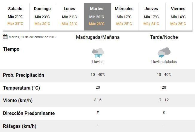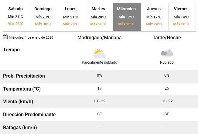 El primer día del 2020, en tanto, transcurrirá con un cielo nublado, una mínima de 17°C y una máxima que se ubicaría en unos 25°C. De acuerdo con los especialistas del SMN, el miércoles finalmente cesarán las lluvias y comenzará a mejorar el tiempo en La Plata.