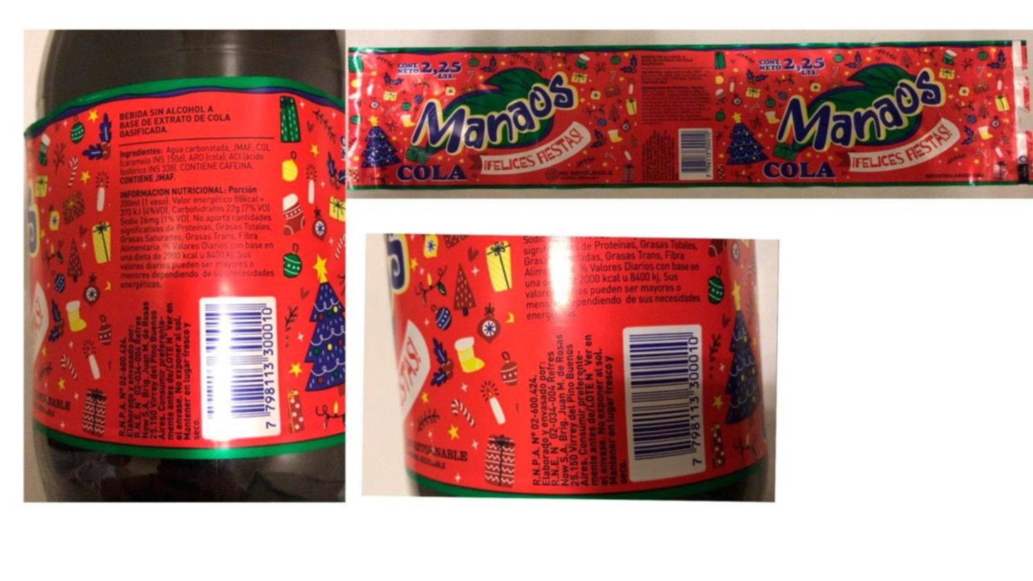 Según se informó, se trata de la bebida sin alcohol a base de extractos de cola gasificada Marca Manaos - Felices Fiestas por 2.25 litros.