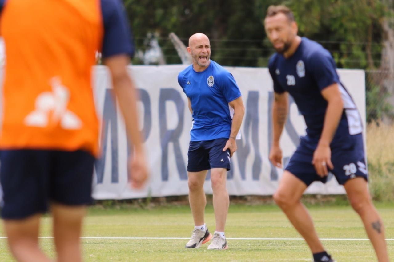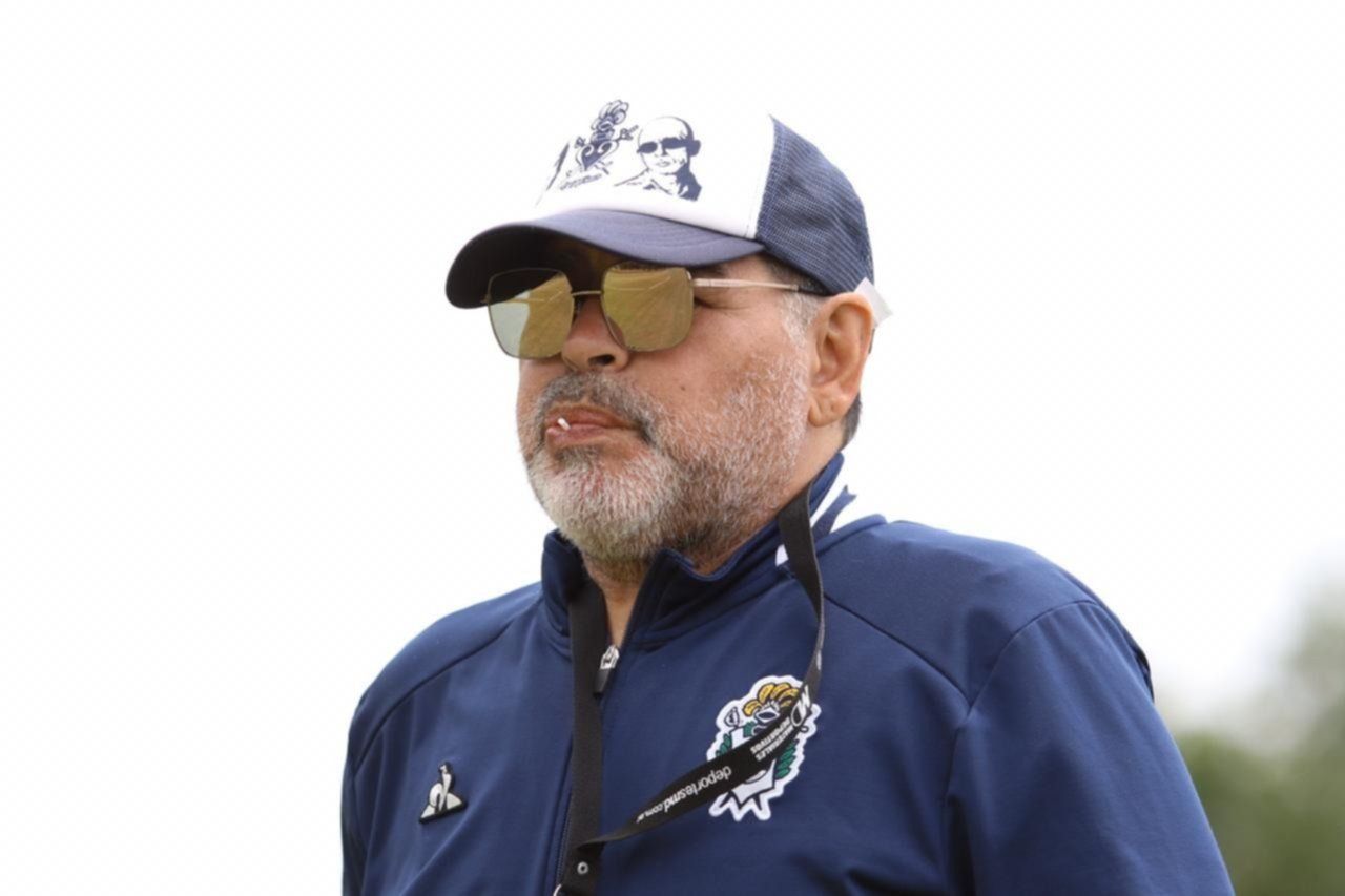 Con lentes espejados color marrón, chupetín en la boca y una gorra con el escudo de Gimnasia y la imagen del Indio Solari, Maradona se puso al frente del entrenamiento albiazul este martes por la mañana.