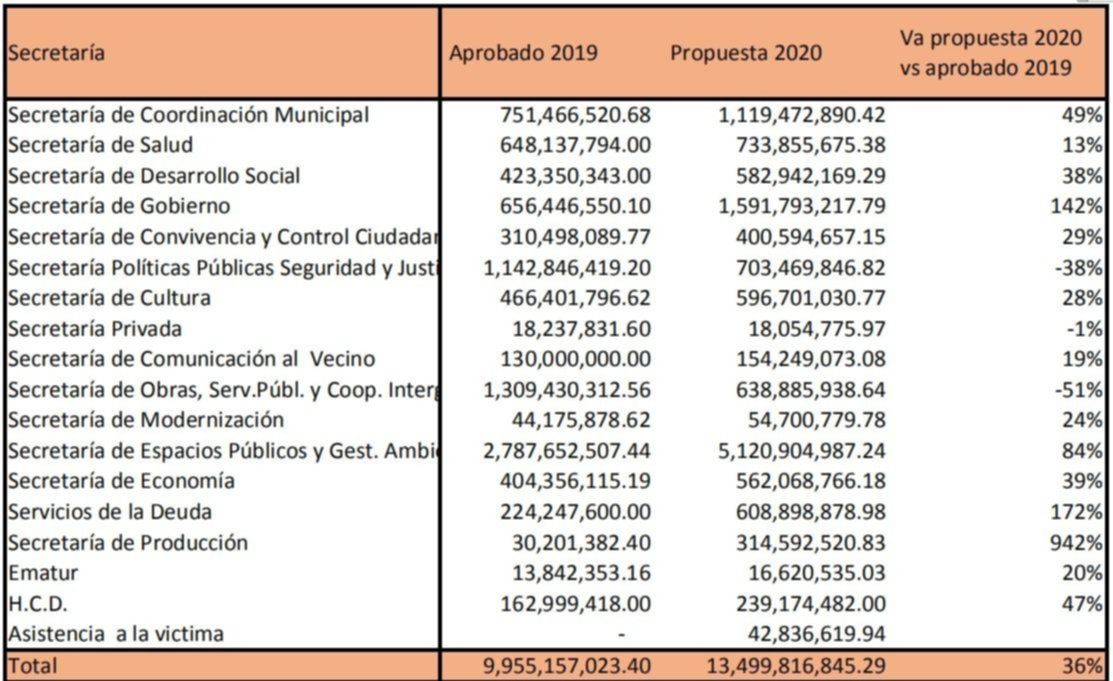Respecto de la distribución de los gastos, el 77% serán absorbidos por las secretarías de Salud, Seguridad, Desarrollo Social, Obras Públicas, Espacios Públicos, Gobierno y Coordinación Municipal. La de Espacios Públicos, con un presupuesto $5.120.904.987,24 es la más alta, con la recolección de residuos con un gasto estimado de $3.344.000.000 y el gasto en consumo y mantenimiento de alumbrado público con un gasto presupuestado de $632.000.000.