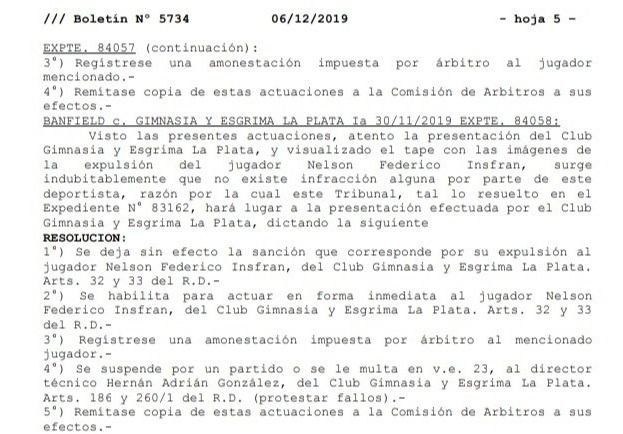 El Tribunal de Disciplina de la AFA le dio lugar al pedido de Gimnasia y decidió habilitar al arquero Nelson Insfrán, que había sido mal expulsado en la última fecha en el duelo ante Banfield. Entre los fundamentos que fueron publicados en el boletín, el organismo señaló que “no existe infracción alguna” y por ende decidieron darle lugar a la presentación del club mens sana. El joven estaba haciendo su debut y, como consecuencia de una mala tarde del árbitro Fernando Espinoza, solo pudo estar en cancha 30 minutos. La intención de Diego Armando Maradona es que este domingo vuelva a ser titular ante Central Córdoba de Santiago del Estero en el Bosque.