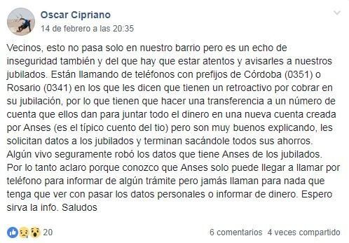 "Algún vivo seguramente robó los datos que tiene Anses de los jubilados. Sé que solamente pueden llegar a llamar para informar de algún trámite pero jamás para nada que tenga que ver con pasar datos personales o cuestiones de dinero", finalizó el denunciante.