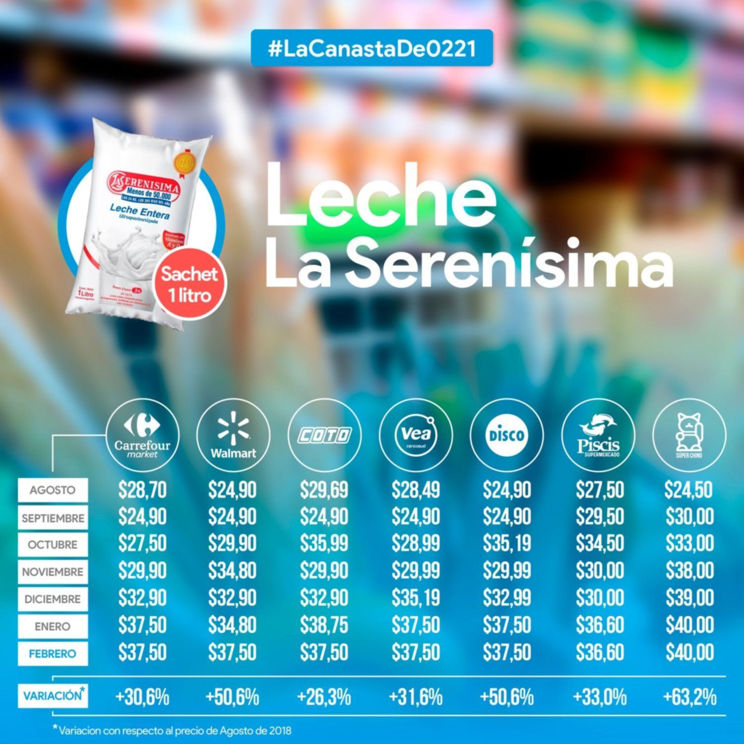 El litro de La Serenísima en febrero no se consiguió por menos de $36 y desde el inicio de este informe hubo una variación de entre el 26 y el 63%. En ese sentido, en los últimos seis meses el supermercado chino la subió $15,50.