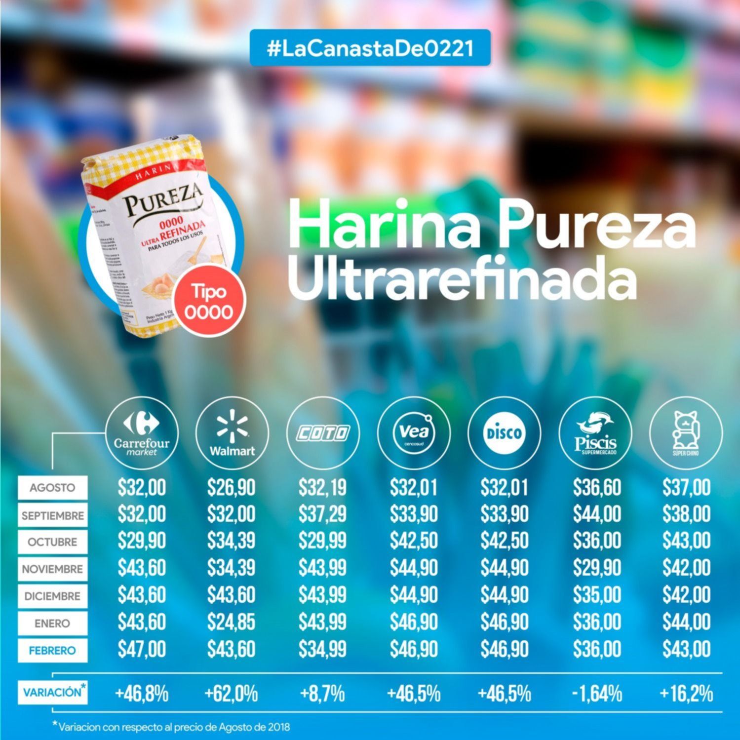 Con el kilo de la variedad 0000 se dieron los dos extremos. Walmart no pudo mantener la promoción que rompió el mercado en enero y volvió al precio de diciembre. Subió un 75% con respecto al último informe y la presentó a $43,60. Sin embargo, no fue la más costosa. Ese lugar quedó para Carrefour, que la vendía a $47.