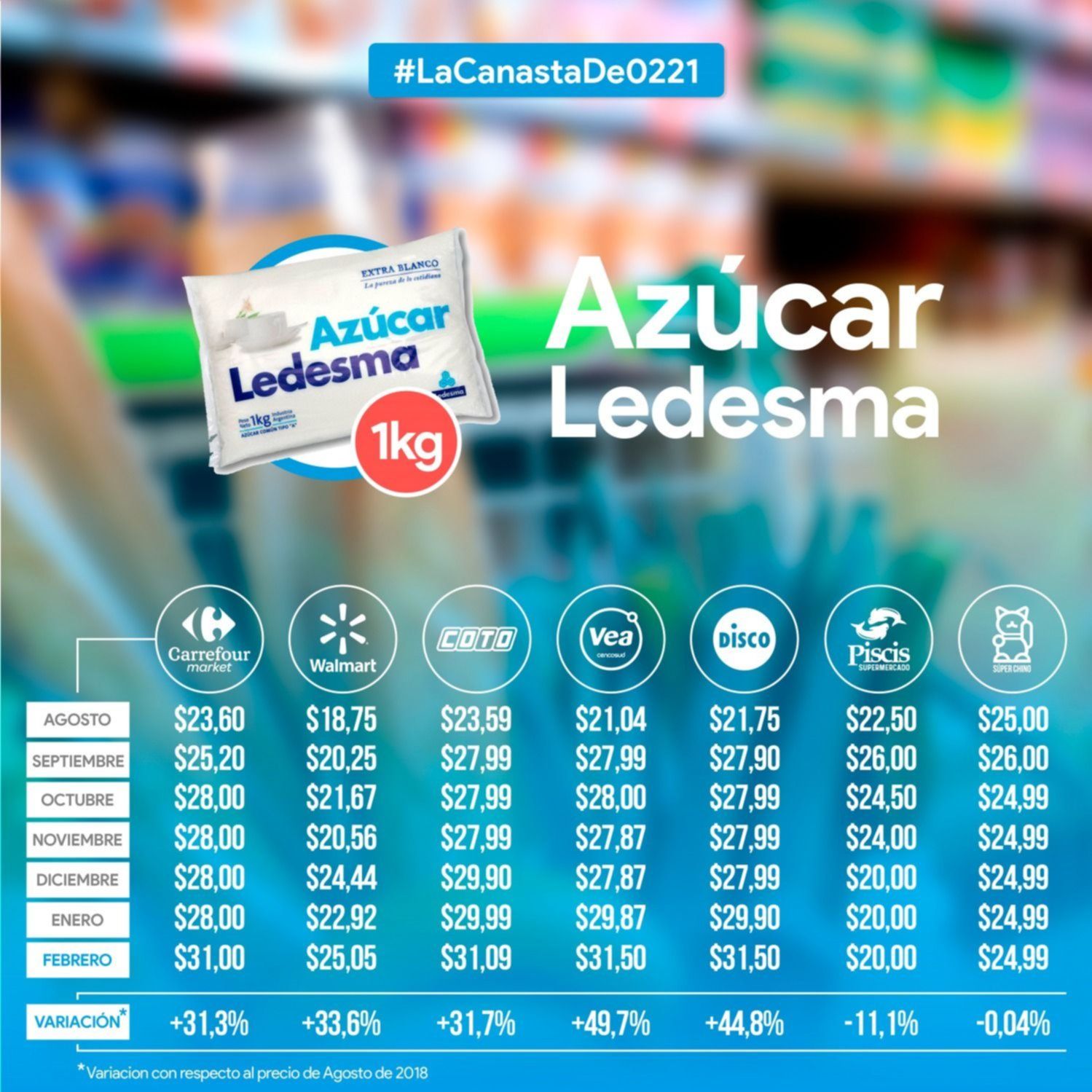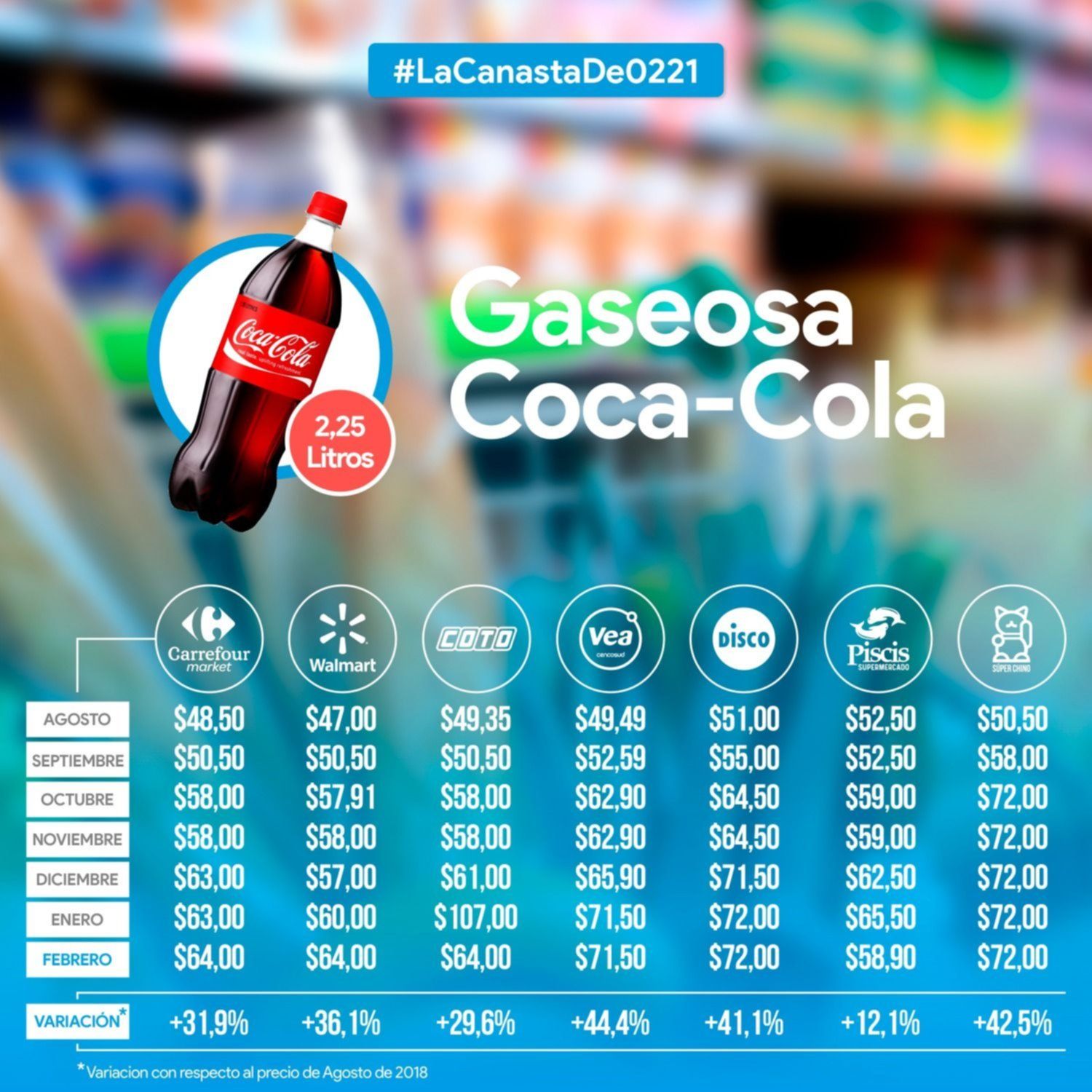 Atrás quedó Walmart, que de un mes a otro la aumentó $2,13 y la vendía a $25,05. Después el valor rondó entre $31 y $31,50 y el que más ajustó el costo fue Carrefour: trepó $3.