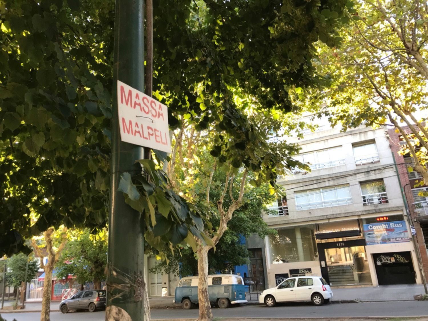 Los formatos son muchos y también las estrategias. Las vías de acceso a la ciudad, como la diagonal 74 o las circunvalación, son territorios apetecibles para colocar pasacalles y cartelones, en el centro avanzan los afiches y los carteles de postes, en los barrios ganan las pintadas en los paredones y los nombres estampados en esténciles.