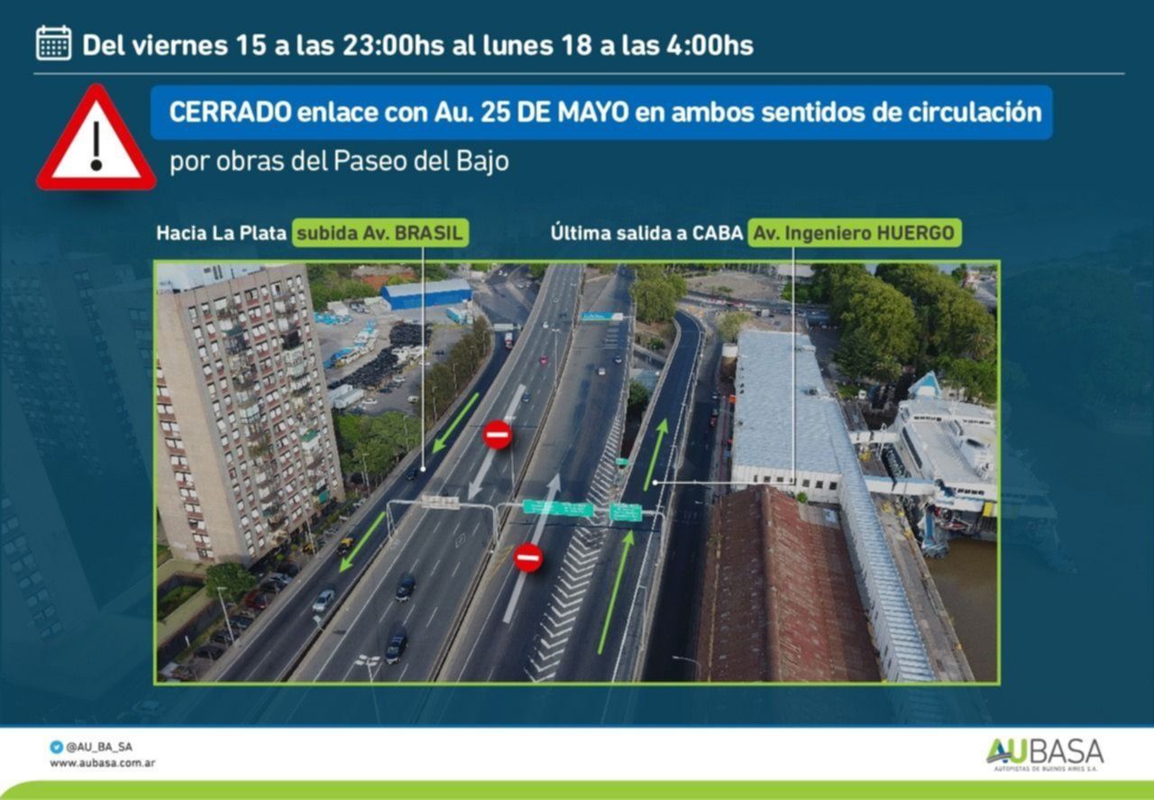 Desde este viernes a partir de las 23, el enlace entre la Autopista La Plata - Buenos Aires y la Autopista 25 de Mayo quedará cerrado en ambos sentidos. El corte se extenderá hasta el lunes a las 4 con el fin de avanzar en la obra de conexión con el futuro Paseo del Bajo, obra que lleva adelante AUSA.