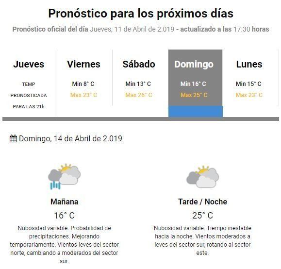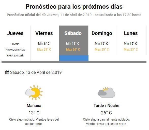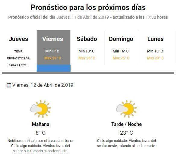 El sábado, en tanto, la temperatura mínima prevista es de 13°C y la máxima 26°C. Además se espera que el tiempo comience a desmejorar hacia la noche, con un cielo parcialmente nublado y vientos del sector norte. El domingo comenzará con nubosidad variable y probabilidad de precipitaciones aisladas en la ciudad, aunque mejorando temporariamente.