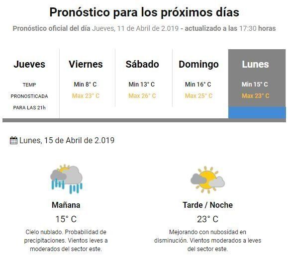 Según adelantaron los meteorólogos del organismo argentino, el clima dará un respiro durante la tarde del domingo, pero las lluvias volverían con más fuerzas durante la mañana del lunes. Con una mínima de 15°C y una máxima de 23°C, está previsto que la semana comience con altas probabilidades de lluvia y vientos leves a moderados soplando del sector este.