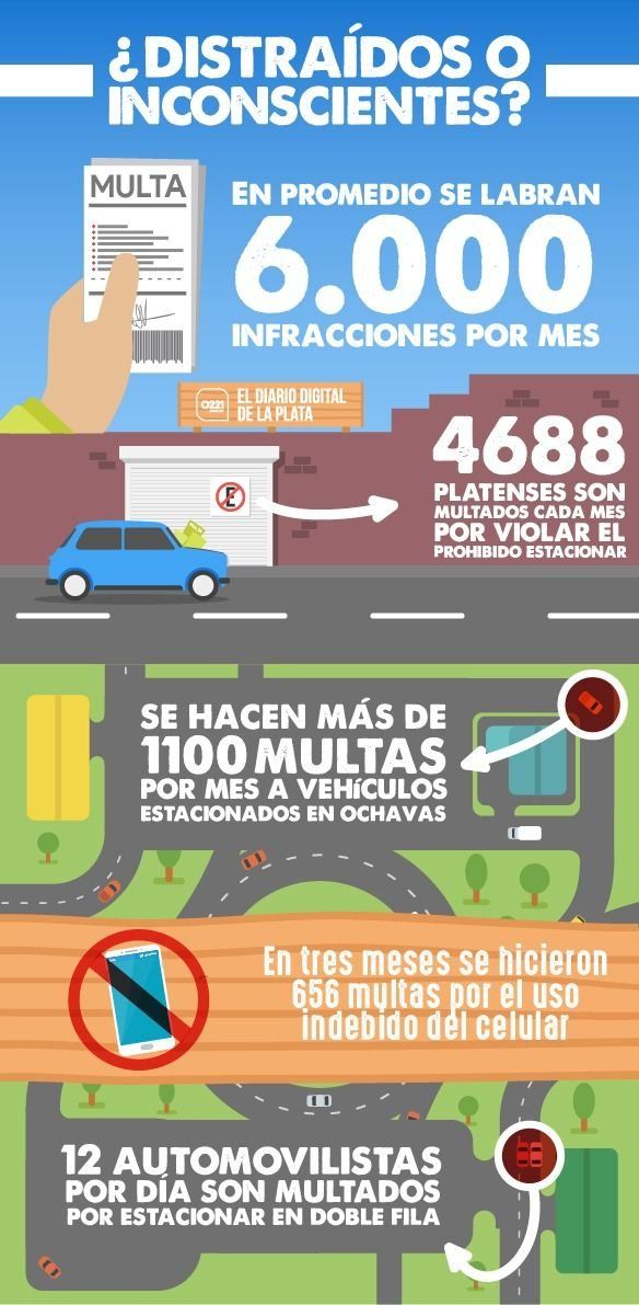 Otro de los motivos más recurrentes de sanciones durante este período fue el uso indebido del celular, que representa un 3,64 % (656). Además, el 3,27% (589) fueron a vehículos que estacionaron sobre la senda peatonal y completan la nómina de infracciones el estacionamiento indebido en zonas de rampas para discapacitados (3.18%), el estacionamiento arriba de veredas (3.02%), llevar adelante carga y descarga en horarios indebidos (2.26%), pasar semáforos en rojo (1.44%), estacionar delante de garajes (1.18%), y circular a contra mano (0.44%), entre otros. A su vez, se detalló que un 14,22% se debe a otros motivos, entre los que se encuentra la ausencia de casco en motos y estacionamiento sobre ramblas, entre otros.