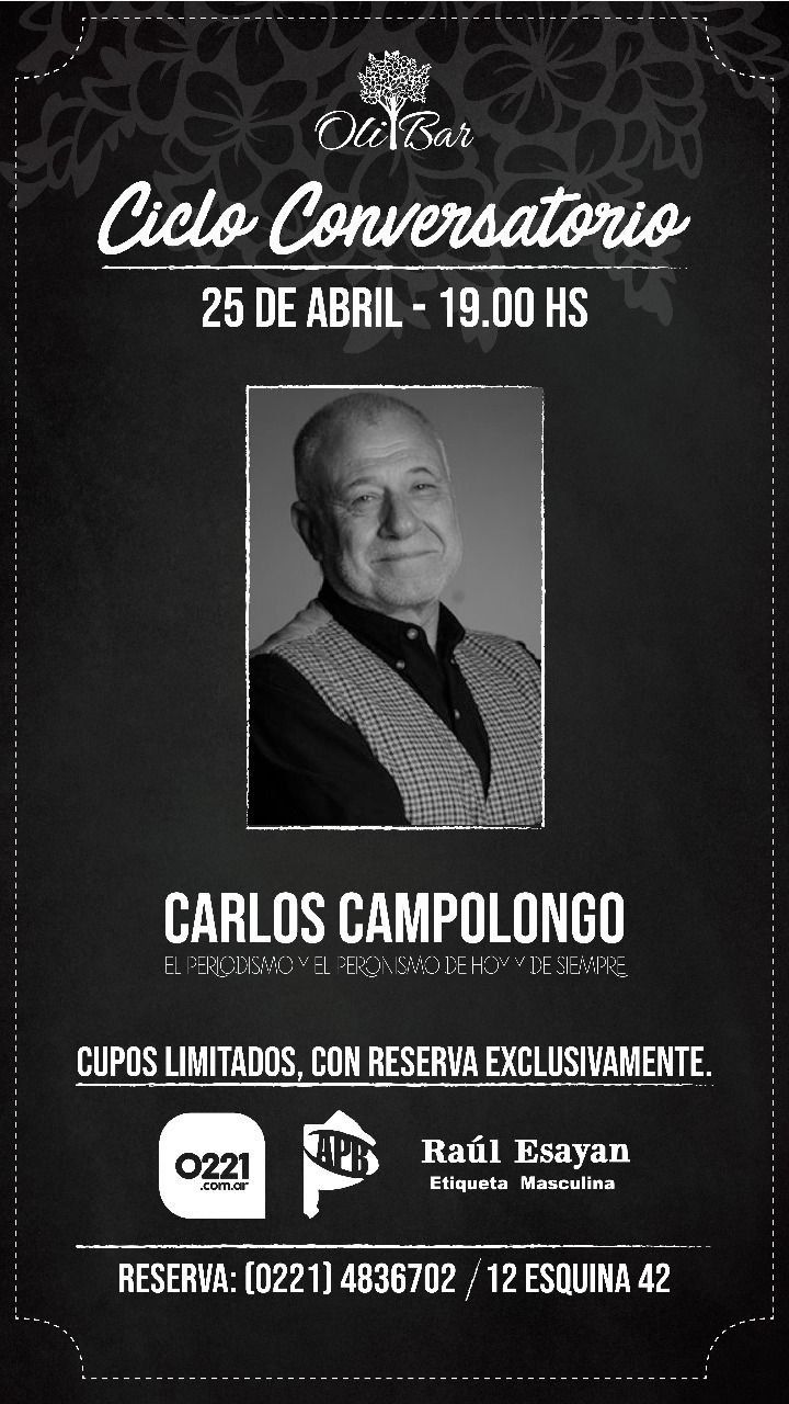 En esta oportunidad, el invitado será el docente, periodista y abogado Carlos Campolongo, quien se referirá a "El periodismo y el peronismo de hoy y de siempre". Campolongo también fue legislador de la Ciudad de Buenos Aires y militante sindical, siempre ligado al peronismo, en el que llegó a desempeñarse como asesor de diferentes candidatos presidenciales como Eduardo Duhalde y Alberto Rodriguez Saá.