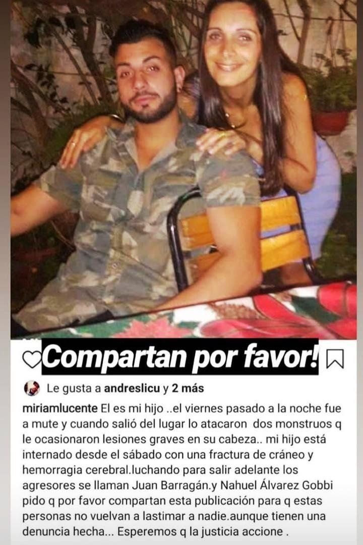 La familia de Mauro Améndola, un joven que fue agredido por dos personas a la salida del boliche Mute, en 13 y 47, pide desesperadamente ayuda para dar con los sospechosos del ataque. El hecho ocurrió en la madrugada del sábado 30 de marzo pasado, cuando el joven salió del boliche, intentó evitar una pelea y fue agredido por la espalda, según explicó Miriam Lucente, madre de la víctima, a 0221.com.ar.