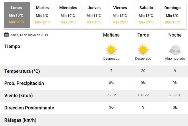 La semana arranca con bajas temperaturas. Esta mañana comenzó con una mínima de 7°C, aunque se espera que el próximo martes sea aún más baja y se ubique en 6°C, Sin embargo, de acuerdo con el pronóstico del SMN, la temperatura irá en aumento a lo largo de la jornada, hasta alcanzar unos 20°C durante la tarde.
