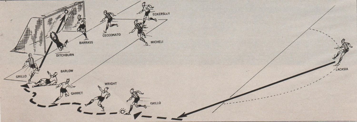 Esa misma tarde se produjo un hecho que marcó historia en el fútbol de argentino. Con el 0-1 en favor de los ingleses, unas 80 mil personas presenciaron el momento en que Grillo controló el balón en el costado izquierdo y se sacó de encima a tres rivales para quedar mano a mano con el arquero. El mediocampista definió de zurda, casi sin ángulo, para poner el 1 a 1 transitorio.