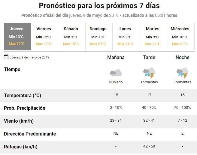El pronóstico no es nada alentador en el arranque de este jueves. De acuerdo con los especialistas la temperatura oscilará entre 13 y los 17°C y aunque la mañana comenzar con buen tiempo, se espera que el clima empeore a lo largo del día hasta el arribo de algunas lluvias y tormentas a la ciudad durante la tarde y noche.