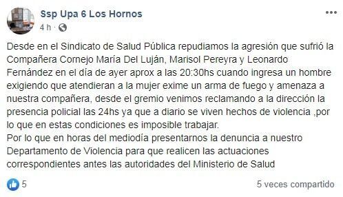 Por su parte, los trabajadores de la salud emitieron un comunicado en Facebook para repudiar el ataque y exigir mayor seguridad: "Desde el gremio venimos reclamando a la dirección la presencia policial las 24 horas, ya que a diario se viven hechos de violencia. En estas condiciones, es imposible trabajar".