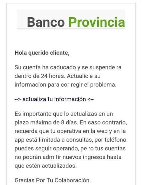"Hoy recibí este mensaje por mail, supuestamente del Banco Provincia, pidiéndome actualización de datos. Me di cuenta a tiempo, antes de ingresar mis datos en la página donde te deriva -que es igual a la del banco, pero no es la página del banco- y por las dudas llamé. Me dijeron que ese trámite solo debe hacerse en la sede física, por banco o por cajero, o sea que es una página trucha", informó una vecina a las autoridades de La Bancaria, el gremio que nuclea a los trabajadores bancarios.
