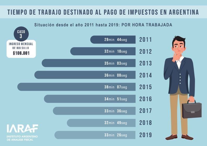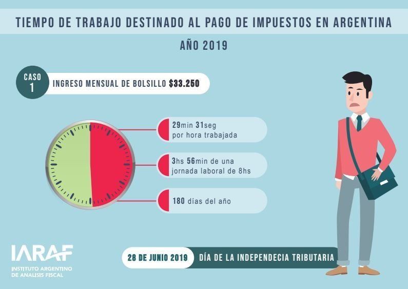 De acuerdo con los cálculos, el "Día de la independencia tributaria" empezó el 28 de junio pasado y seguirá hasta el 31 de julio, dependiendo el caso. Se trata de un indicador utilizado habitualmente para dar cuenta de la carga impositiva que recae sobre los trabajadores, al considerar la cantidad hipotética de días que una persona debe trabajar para pagar impuestos. El Instituto Argentino de Análisis Fiscal (IARAF) reveló que un asalariado promedio deberá destinar entre 180 y 212 días del 2019 al pago de impuestos y servicios. Lo que equivale a que 29 minutos y 31 segundos de cada hora trabajada solo son para cumplir con las obligaciones con el Estado.