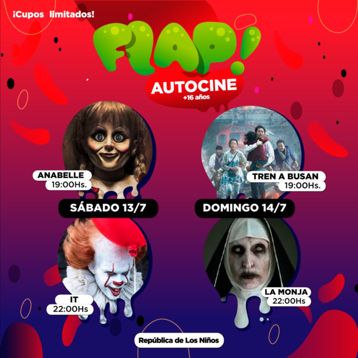 La Municipalidad realizará este sábado y domingo una nueva edición de FLAP! Festivales La Plata, pero esta vez en su novedosa versión autocine. Se trata de cuatro proyecciones gratuitas de reconocidas películas del género de terror que se proyectarán en el estacionamiento de la República de los Niños para que los platenses puedan disfrutarlas desde sus propios autos.