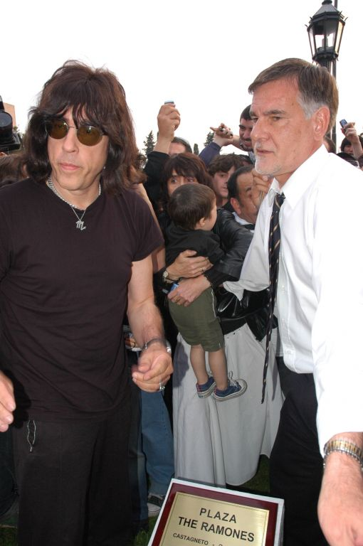 El exbaterista de los Ramones bajó de un auto, alzó a un bebé, le dio la mano al candidato y se fue, sin entender bien lo que estaba sucediendo.