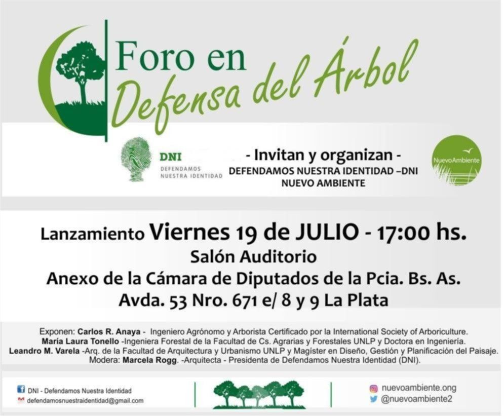 El evento, que se llevará a cabo el próximo viernes, contará con la exposición a cargo de Carlos Anaya, ingeniero agrónomo y arborista certificado por la International Society of Arboriculture; María Laura Tonello, ingeniera forestal de la Facultad de Ciencias Agrarias y Forestales de la UNLP y doctora en ingeniería; y Leandro Varela, arquitecto de la Facultad de Arquitectura y Urbanismo de la UNLP y magíster en Diseño, Gestión y Planificación del paisaje. Todo bajo la moderación de la presidenta de Defendamos nuestra identidad (DNI), la arquitecta Marcela Rogg.
