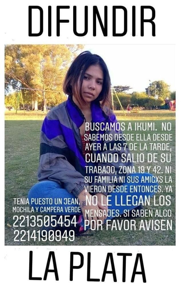 Candela, más conocida como Ikumi, salió de su trabajo en 42 y 19 a las 19 del miércoles y desde ese momento no se supo nada más de ella. La última vez que fue vista, la joven de 20 años vestía un jean y una campera verde y se dirigía a la parada de micro de 19 y 44.
