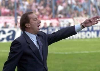 En la imagen, que resume la personalidad del extrenador pincharrata, puede verse a Bilardo de pie y ante dos televisores, con una decena de jugadores detrás, siguiendo con atención todas sus precisas indicaciones.