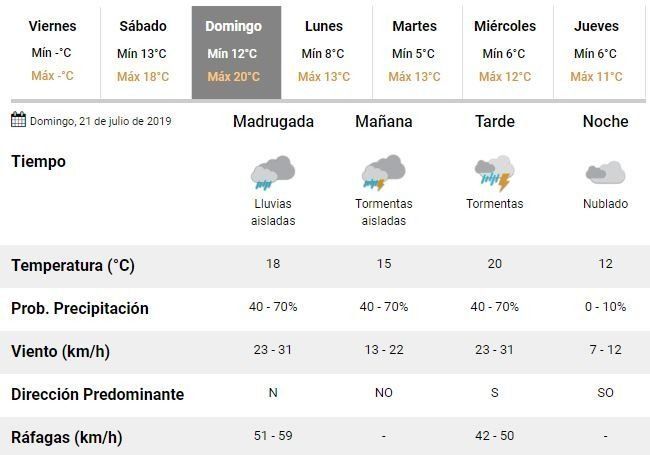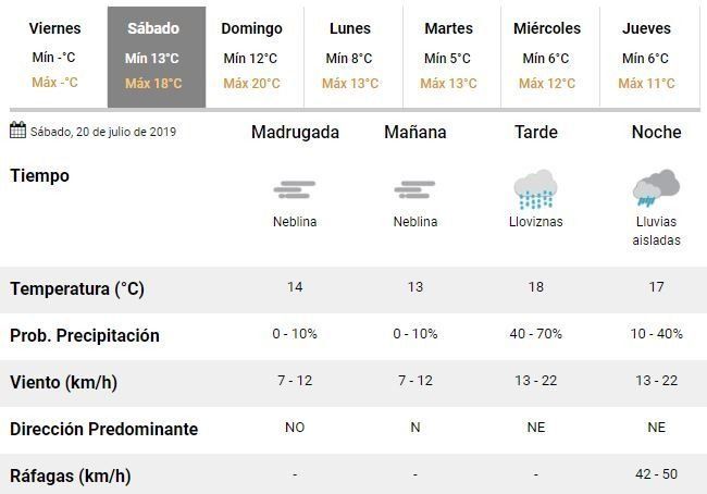 Para el sábado se espera una temperatura mínima de 13°C y una máxima de 18°C. Aunque la mañana comenzará con un cielo nublado y sin precipitaciones, se esperan que el tiempo desmejores a lo largo de la jornada y se registren algunas lluvias aisladas hacia la noche.
