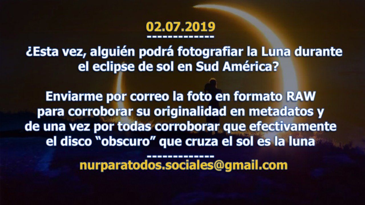 "¿Esta vez alguien podrá fotografiar la Luna durante el eclipse de sol en Sudamérica? Enviarme por correo la foto en formato RAW para corroborar su originalidad en metadatos y de una vez por todas corroborar que efectivamente el disco 'obscuro' que cruza el sol es la Luna". Con ese mensaje, el máximo referente del terraplanismo en La Plata y toda esta parte del mundo, Iru Landucci, volvió a lanzar una desafiante convocatoria con la intención de seguir cuestionando que la Tierra sea esférica. Todo, en el marco del eclipse solar que se verá durante la tarde de este martes.
