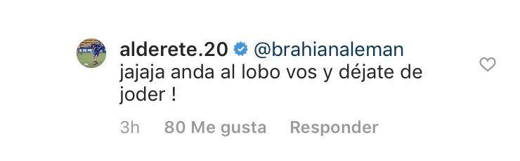 Con este contexto y en un cruce particular en la red social Instagram, Alderete aprovechó para darle un consejo al uruguayo: "Anda al lobo vos y déjate de joder!". Inmediatamente después de que el exdefensor tripero pusiera esto, provocó una catarata de reacciones de los hinchas albiazules que ratificaban lo dicho por el paraguayo y seguían insistiendo para tratar de convencer a Alemán.