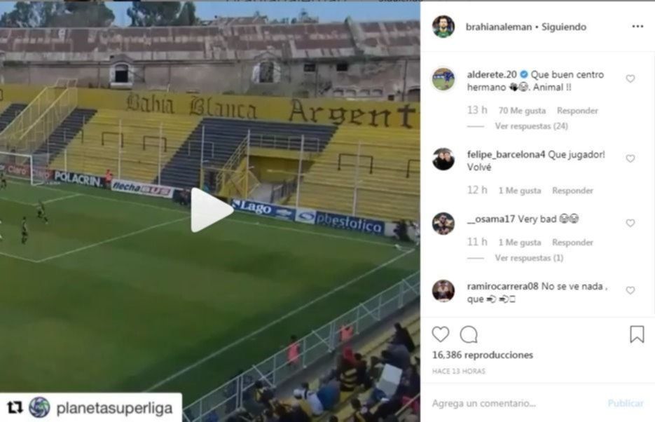 "Qué buen centro hermano . Animal !!", comentó Omar Alderete, en tono de broma, luego de que Brahian Alemán publicara el video del inolvidable gol olímpico que le hizo a Olimpo vistiendo la camiseta de Gimnasia. El posteo encendió nuevamente las alertas en el pueblo mens sana, que espera ansioso su regreso.