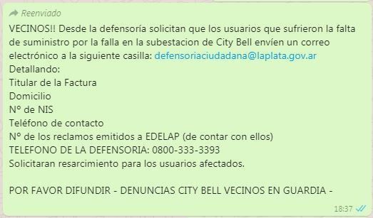 En ese marco, en los últimos días comenzó a circular un mensaje que corrió como reguero de pólvora en WhatsApp y 0221.com.ar confirmó que el breve escrito fue compartido sobre la base de un comunicado difundido por la Defensoría Ciudadana de La Plata.