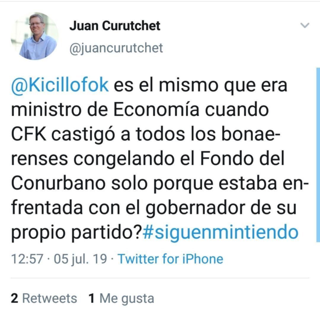 El presidente del Banco Provincia, Juan Curutchet, fue uno de los funcionarios públicos provinciales que salió al cruce de las declaraciones que hizo el candidato a gobernadora Axel Kicillof en su visita a la redacción de 0221.om.ar. Desde su cuenta de Twitter, el economista lanzó que "@kicillofok es el mismo que era Ministro de Economía cuando CFK castigó a los bonaerenses congelando el Fondo del Conurbano solo porque estaba enfrentada con el Gobernador de su propio partido" y se sumó así a la catarata de mensajes publicados en la redes sociales con el hashtag #QuéHizoKicillofEnPBA.