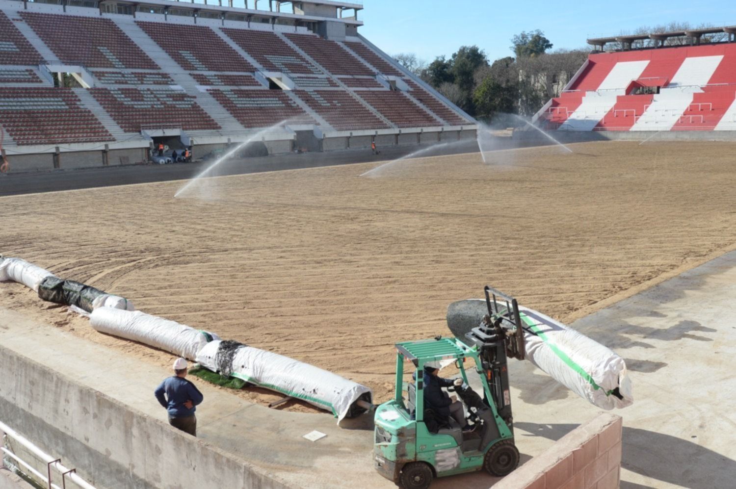 La construcción del estadio de Estudiantes se encuentra en la recta final y todos trabajan con el objetivo de llegar al 9 de noviembre con todo en condiciones.Luego del primer sembrado empezó a desplegarse el Playmaster para conformar el césped del terreno de juego. Mirá la galería que acompaña esta nota.