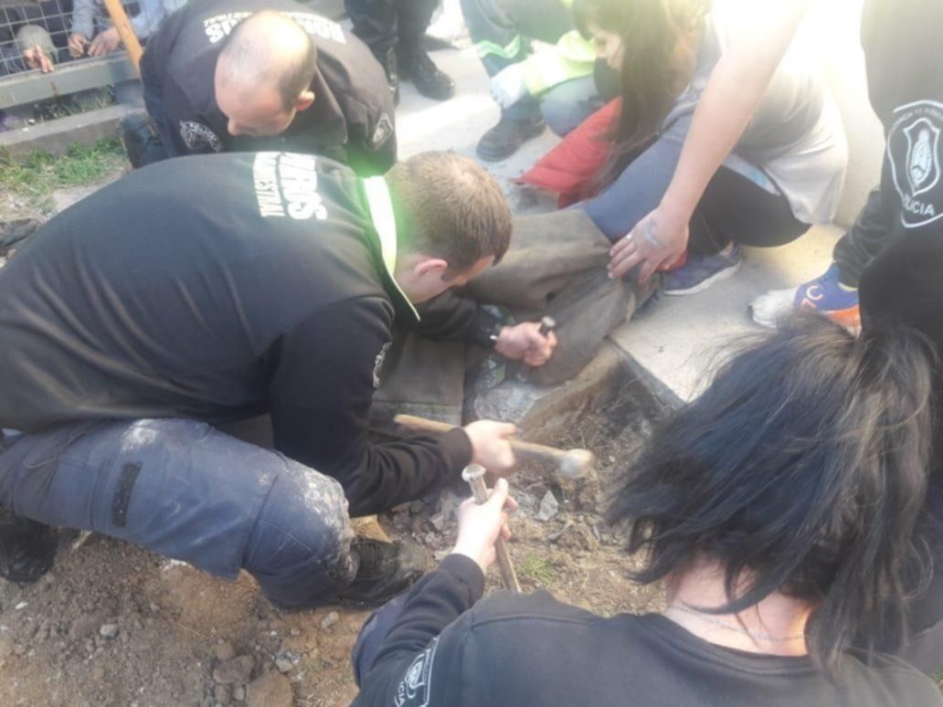 El hecho ocurrió este jueves por la tarde en una vivienda ubicada sobre calle 115 y 515. La criatura cayó en una cámara de inspección de 20 centímetros por 20, tipo rejilla de sumidero, donde quedó atrapado. Su cuerpo estaba dentro y la cabeza fuera, por lo que los rescatistas tuvieron que remover el concreto que rodeaba el desagüe para agrandar el hueco y poder retirarlo.