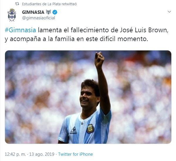 "Gimnasia lamenta el fallecimiento de José Luis Brown, y acompaña a la familia en este difícil momento", reza el posteo que está acompañado con la imagen del Tata vistiendo la camiseta de la Selección argentina. La cuenta de Twitter de Estudiantes compartió la publicación, en un gesto de agradecimiento al club mens sana.