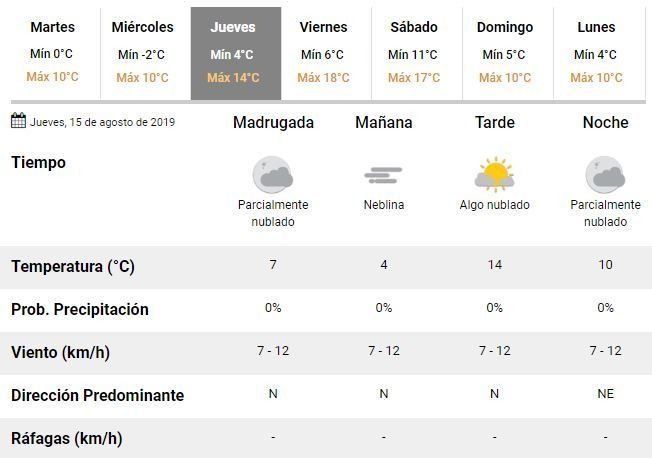 A pesar del frío, se prevé un día con excelente tiempo, cielo despejado y sol. El viento soplará leve desde el sudeste, rotando al norte.