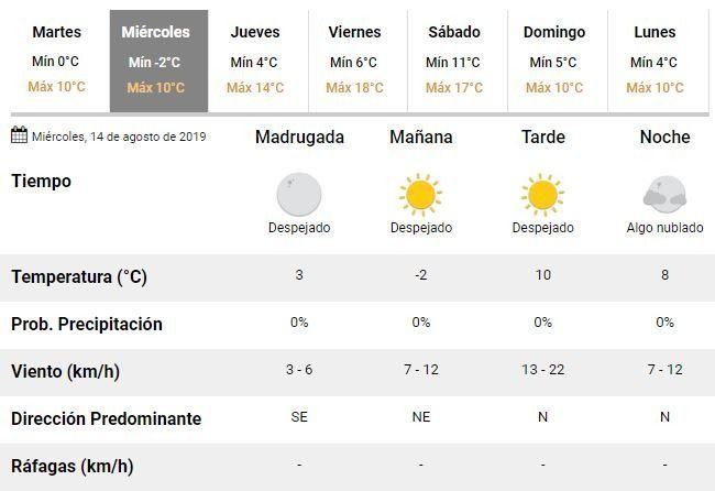 Los especialistas adelantaron que este miércoles el día amanecerá, una vez más, con temperaturas por debajo de los cero grados. Según explicaron, se espera que la jornada abra con -2°C de mínima y que la máxima pueda llegar hasta los 10°C.