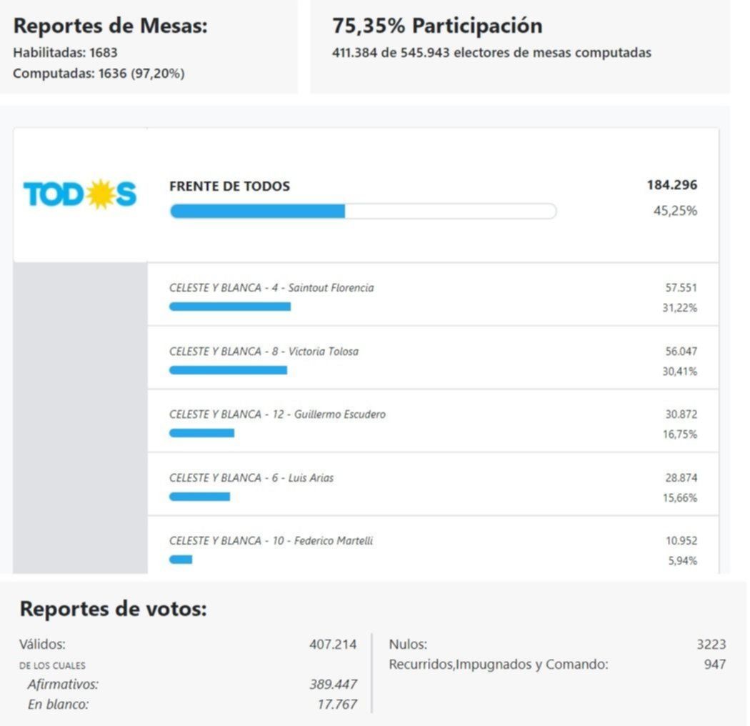 En las PASO del domingo, si las cuentas se sacan con el total de los votos válidos positivos (y según el escrutinio provisorio) la interna del Frente de Todos la ganó Florencia Saintout con el 14,77% de los votos, seguida de Victoria Tolosa Paz con el 14,39%, en tercer lugar está Escudero con el 7,92%. Detrás de él quedaron Arias con el 7,41% y Federico Martelli con el 2,81%.
