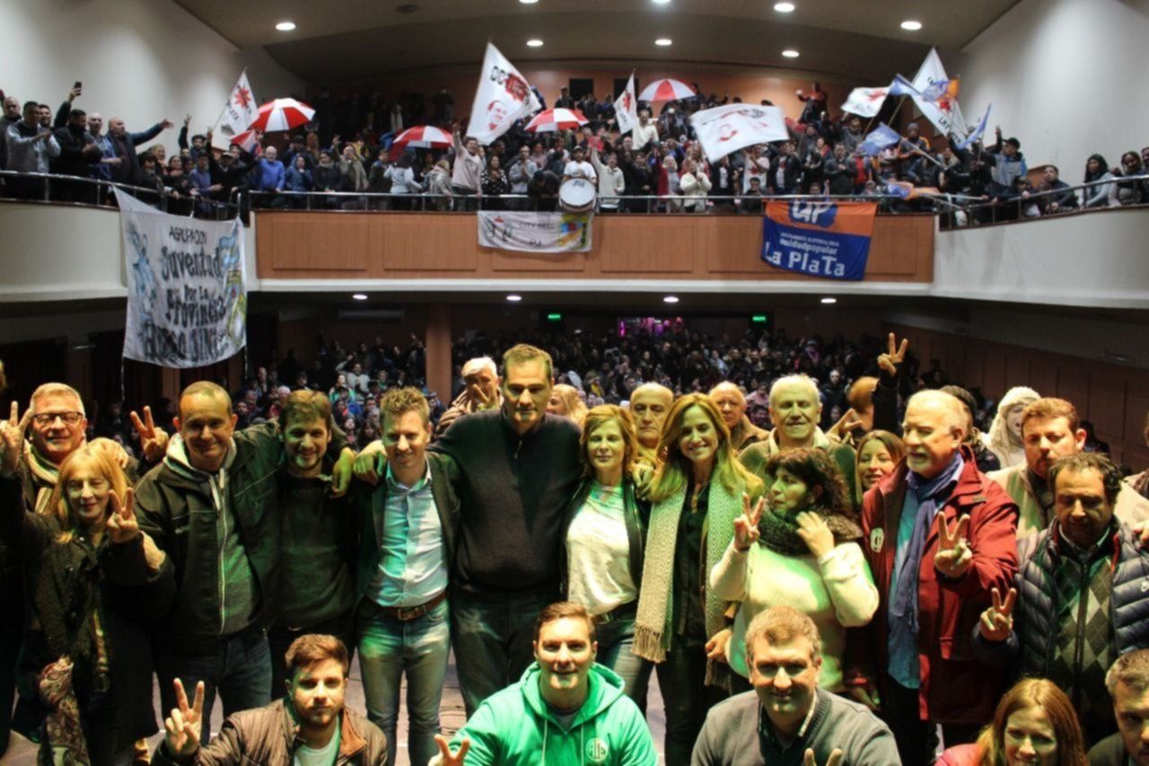 En el escenario estuvieron también los precandidatos a intendente Guillermo Escudero y Federico Martelli, mientras que el ex juez Luis Arias (otro de los competidores) adhirió pese a no haber podido participar. Además estuvieron varios de los referentes de las organizaciones sociales y políticas que integraron los cinco armados que compitieron el 11 de agosto. Entre ellos estuvo el presidente del PJ, Luis Lugones, quien aportó el respaldo formal de esa estructura. Y fue uno de los protagonistas el ahora candidato a senador, el líder de los canillitas Omar Plaini.