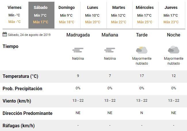 El fin de semana comenzará con neblinas y un cielo nublado. Al menos así lo adelantaron los especialistas del Servicio Meteorológico Nacional (SMN), quienes indicaron que la temperatura oscilará entre los 7 y 17°C a lo largo del sábado.