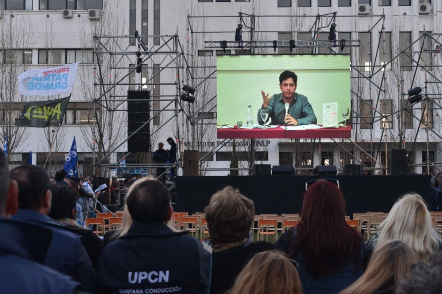 Kicillof mantuvo una reunión con decanos de la UNLP y directores de los Colegios universitarios de La Plata con el objetivo de avanzar en una agenda común en materia educativa. Luego, presentó el libro "Radiografía de la provincia de Buenos Aires. Crisis de un territorio en disputa" -que escribió junto a Cecilia Rodríguez, Silvina Batakis y Pablo Manzanelli, entre otros- en el Aula Magna de Psicología.