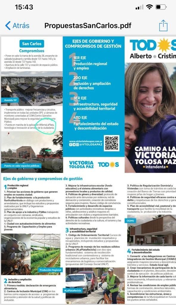 La propuesta aparece en parte del material de campaña que la concejal sacó en los últimos días cuando habla de los compromisos de una gestión suya: "puesta en marcha de la aplicación #AlertaLaPlata, tecnología e innovación al servicio de la ciudadanía".