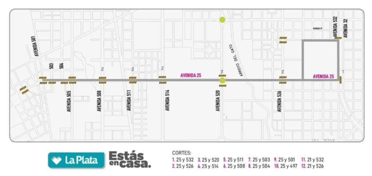 Por eso el tránsito estará interrumpido en sentido City Bell – La Plata, en la Avenida 25 y las calles 532, 526, 520, 514, 511, 508, 503, 504, 501 y 497. Asimismo, se establecerán cortes en la calle 21 y su intersección con las calles 532 y 526.