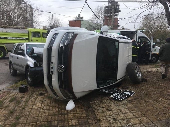 A raíz del fuerte golpe, la camioneta terminó volcando y hasta derribó el cartel nomenclador instalado en la esquina.