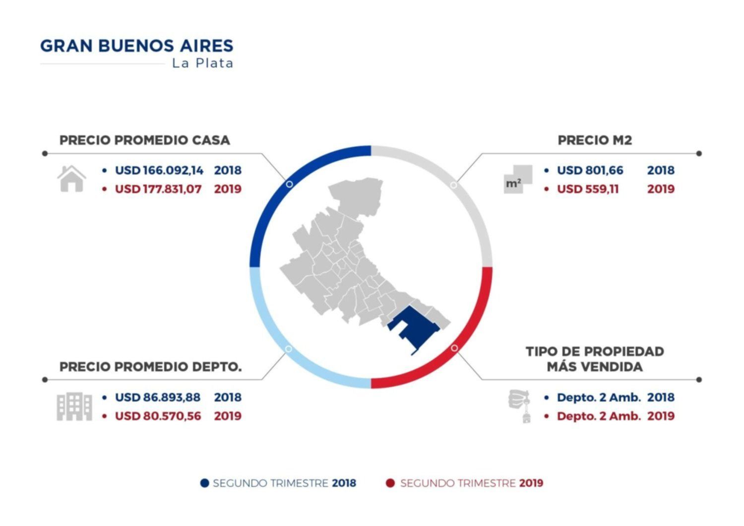 En el segundo trimestre del año el valor promedio por m2 de los inmuebles en La Plata bajó un 30%. Mientras que en 2018 costaba poco más de 801 dólares, en julio de este año promedió los 599, más de 200 dólares abajo. Haciendo un promedio de los valores en G.B.A., de acuerdo a la zona (zona sur, zona norte y zona oeste) el valor medio por m2 se ubica en los 740 dólares, un 20% menos que el mismo período. Se trata de un relevamiento que deja a la capital bonaerense como una de las más caras de la región, aún en baja.