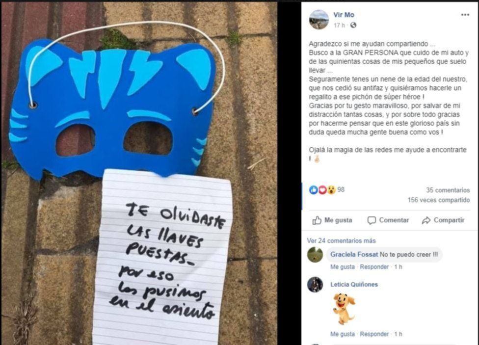 "Busco a la gran persona que cuidó de mi auto y de las quinientas cosas de mis pequeños que suelo llevar". Así arranca la publicación de Vir Mo, con la que lanzó una campaña para poder encontrar a quienes la ayudaron. Es que en las últimas horas dejó puestas las llaves en la puerta de su auto, alguien las vio y las dejó en uno de los asientos junto a un mensaje. A minutos de haberlo publicado en Facebook, el relato se volvió viral.